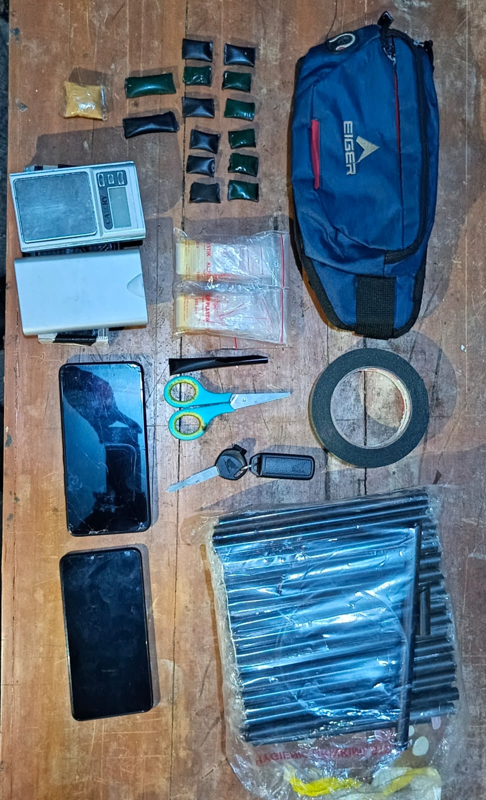 Saat penggeledahan, petugas menemukan satu paket sabu di saku tersangka serta tujuh paket lainnya di dalam tas selempang milik MIS.